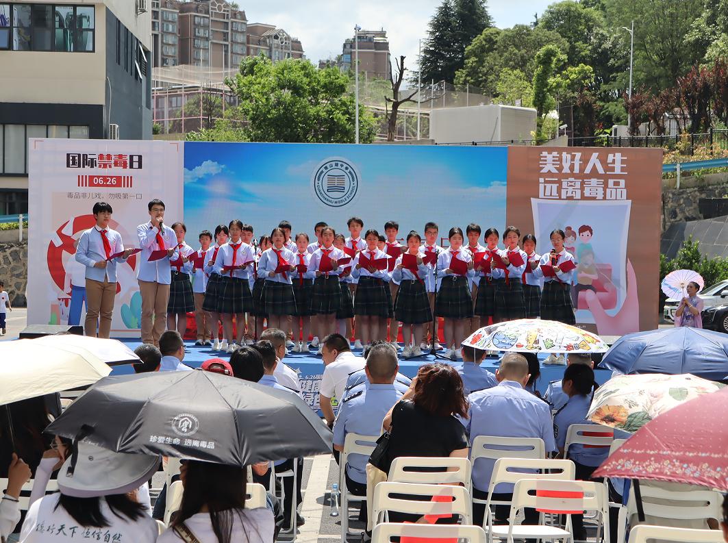在主持人带领下,现场全体市民群众及工作人员进行禁毒誓词宣誓“自觉抵御毒品的侵蚀,积极投身禁毒斗争……”用铿锵有力的誓言表达了抵制毒品、参与禁毒的坚定决心。来自观山湖中学八年级学生刘骏腾和周俊燊表示:“作为青少年我们应该远离易涉毒场所及禁止未成年人进入的场所,那种地方在我看来会让我们对毒品的接触防不胜防。对于陌生人给我们的东西我们应该拒绝。”