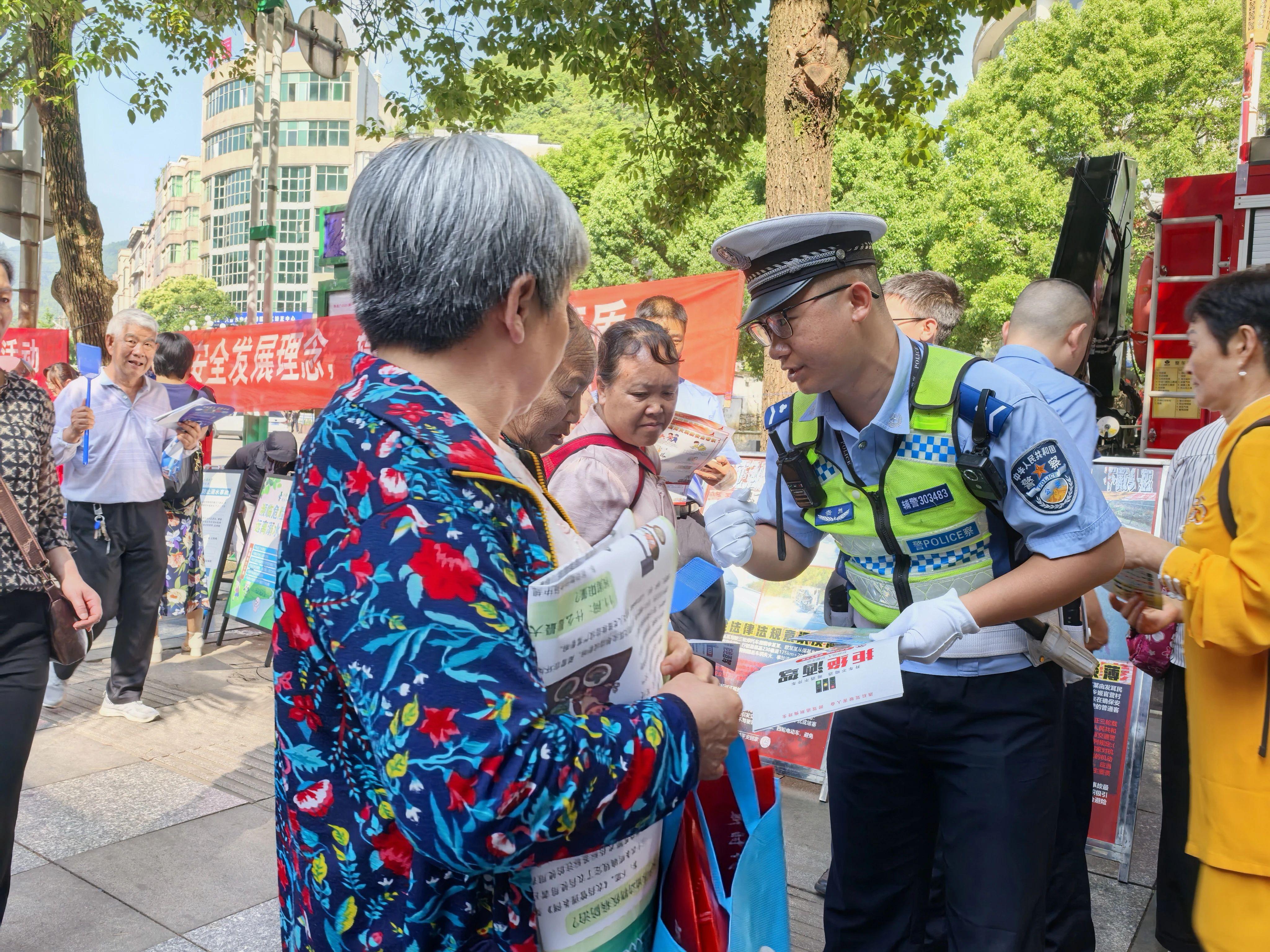 活动现场,气氛热烈而有序。民警通过多种形式向过往群众宣传安全生产相关知识。交警部门重点围绕道路交通安全展开宣传,现场设置了交通安全宣传展板,展示了近年来因不遵守交通规则而导致的交通事故案例,以直观的画面让群众深刻认识到遵守交通法规的重要性。同时,交警还向群众发放交通安全宣传手册,倡导大家遵规守法明理、安全文明出行。治安部门则聚焦消防安全、防溺水安全以及防电信诈骗等内容开展宣传,提醒群众提高自身防范意识和应急处置能力。