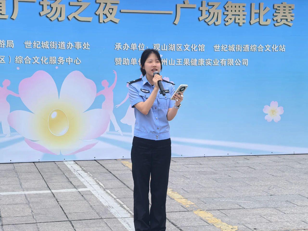 近日,贵州省贵阳市观山湖区文体广电旅游局、世纪城街道办事处在世纪金源购物中心广场联合主办“跳出风采・舞动一夏”广场舞比赛,观山湖区分局世纪城派出所以此为契机,开展了一场别开生面的反诈宣传,为这场文化盛宴和现场群众增添了实用且暖心的安全底色。