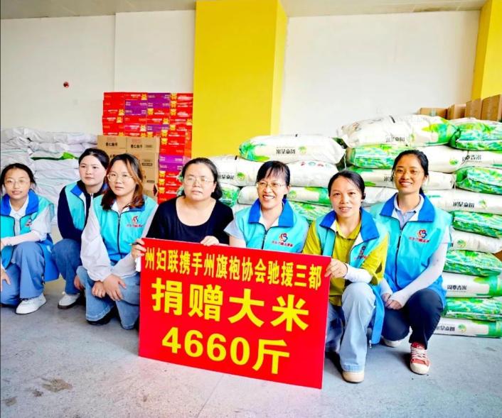 同时,充分发挥桥梁纽带作用,联动州旗袍协会发起爱心募捐行动。通过线上线下多渠道踊跃捐款,两天内筹集善款1万余元。根据三都县物资需求,专项采购大米送至灾区,有效缓解受灾群众的“粮袋子”难题。