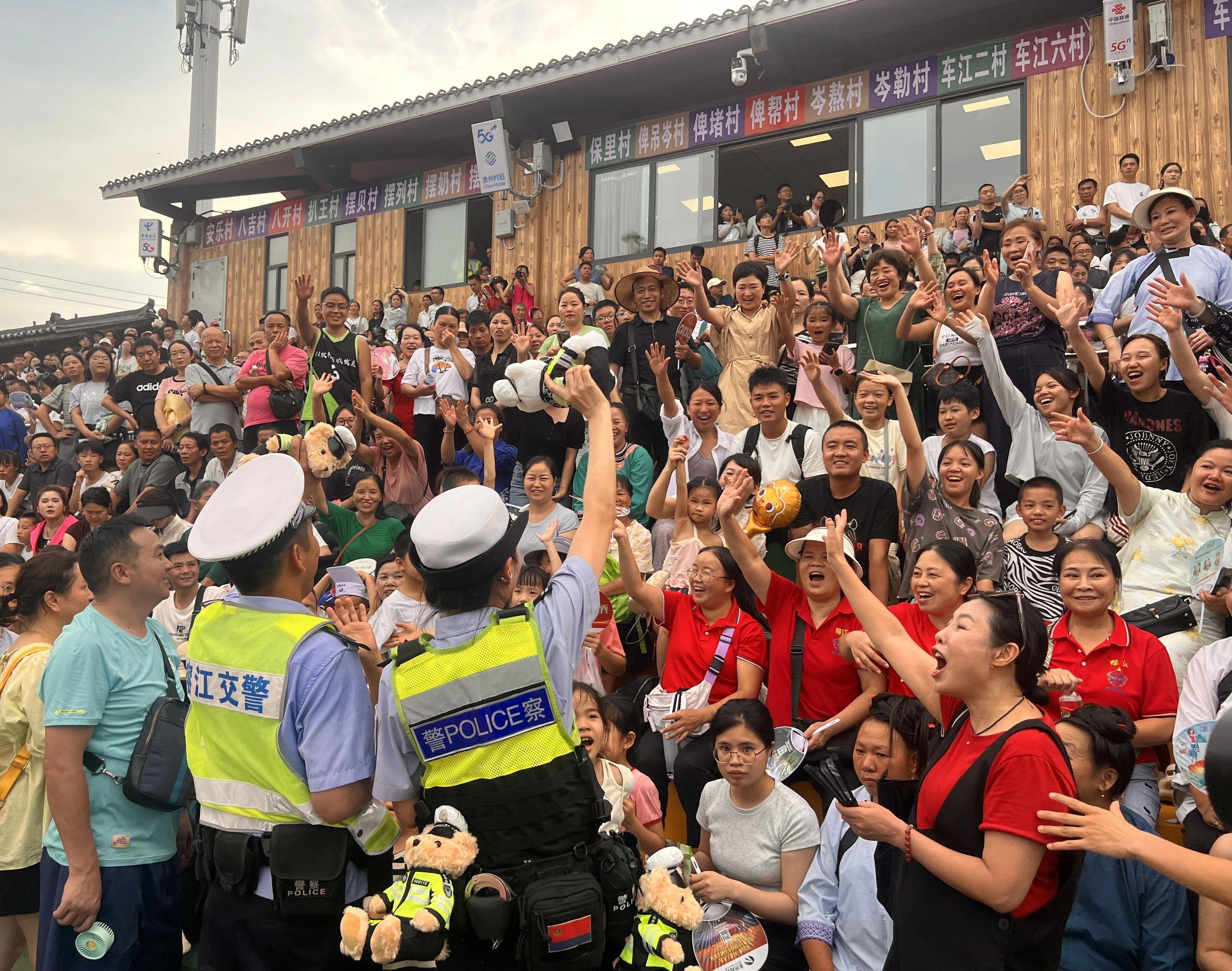 赛场内,球员们奋力拼抢,点燃激情;赛场边,一抹特别的“荧光绿”“平安蓝”同样引人注目。贵州公安交管总队联合榕江交警,将交通安全课堂直接搬到了沸腾的观众席旁,“答题赢警用小熊”互动区人头攒动。