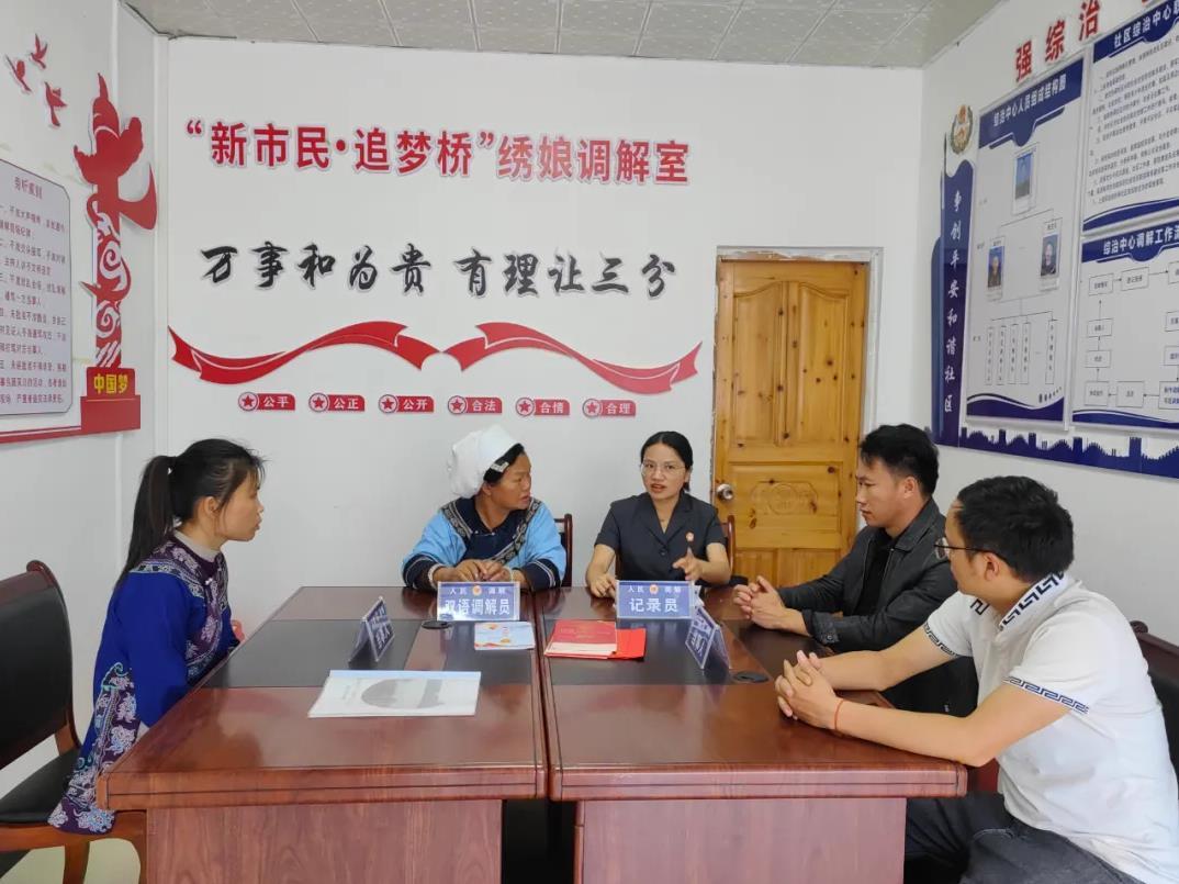 同时,依托非物质文化遗产资源,成立“绣娘调解室”,组建“水乡巾帼调解队”,以柔性调解化解家庭矛盾;建立苗族“三长”(房长、族长、村长)与法庭联动机制,强化亲情纽带作用;融入布依族民俗文化,打造“堂屋说事”解纷平台,让纠纷化解更贴近群众生活。此外,法院还创新运用民族文化元素,创作“离婚劝和歌”“孝道传承歌”等文艺作品,将民族文化与司法调解深度融合,累计化解家事纠纷1495件,实现法律效果与社会效果的有机统一。