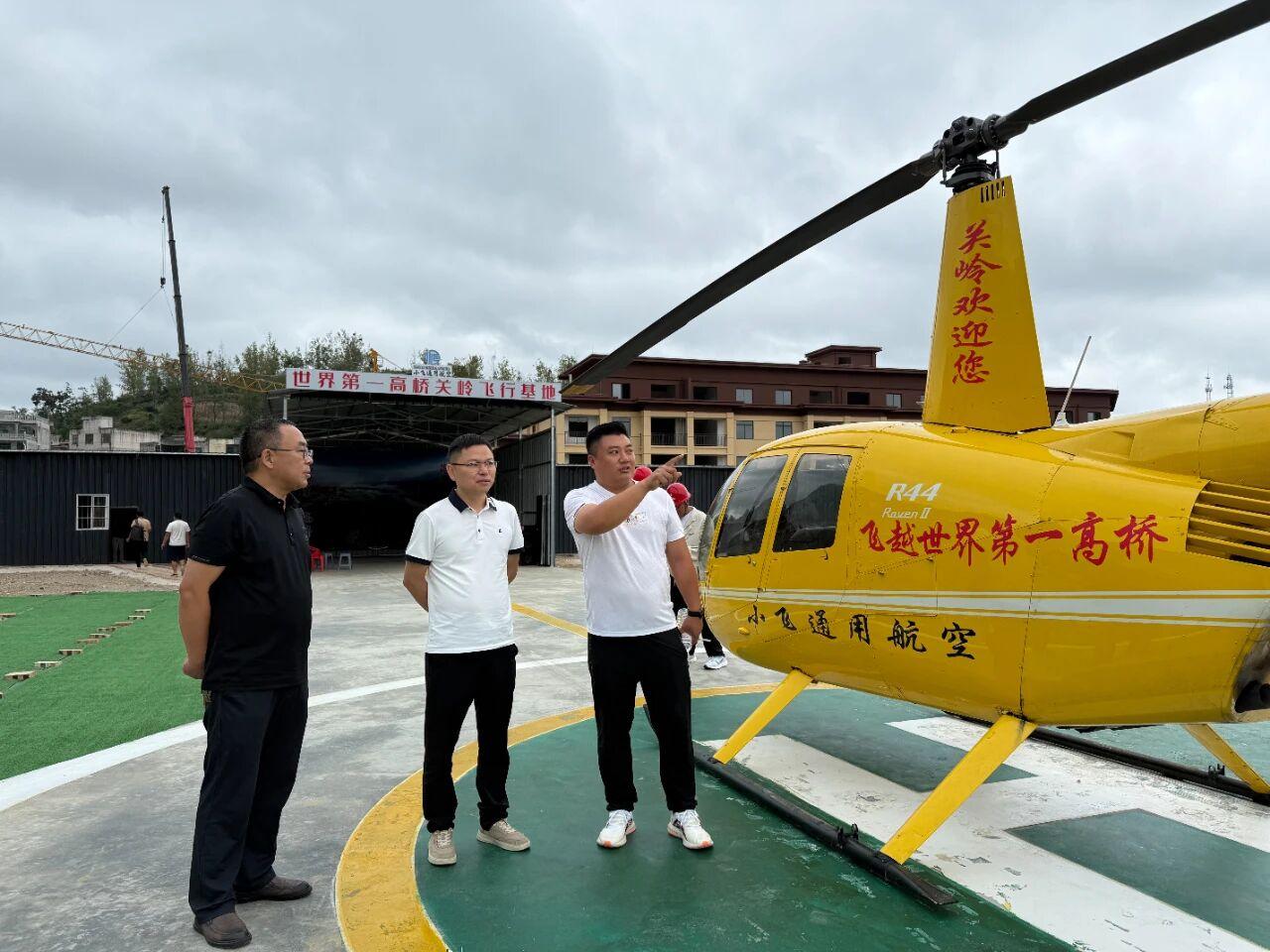 在走访飞行基地过程中,陈治与基地负责人深入交流,详细询问了项目建设进度、遇到的困难以及未来规划。据了解,目前基地已正式投入运营,游客可乘坐直升机从空中俯瞰世界第一高桥——花江峡谷大桥的雄伟身姿,领略峡谷的壮美风光,实现“水陆空”360度无死角观赏。