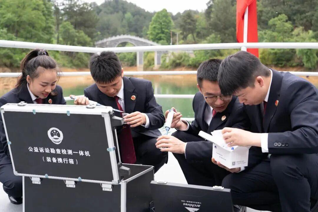 图为检察人员开展水污染检测调查取证工作。