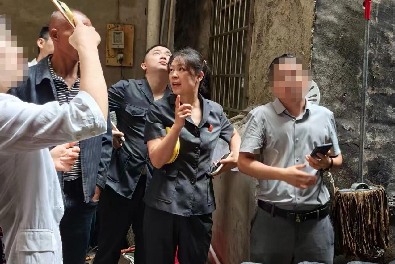 图为法官实地查看雨棚情况。