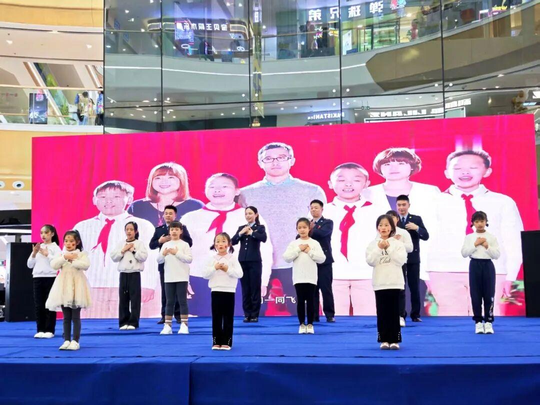 图为黔南州税务局普法工作者与小朋友们共同演绎手势舞《宪法伴我成长》。