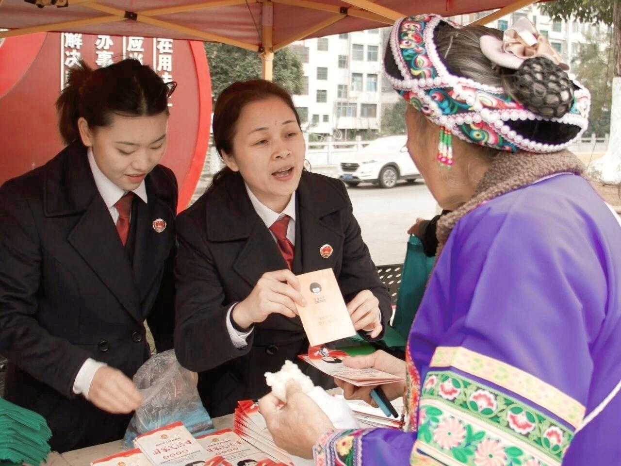 图为盘州“金彩未检”志愿服务队人员给群众分发宣传手册并讲解。