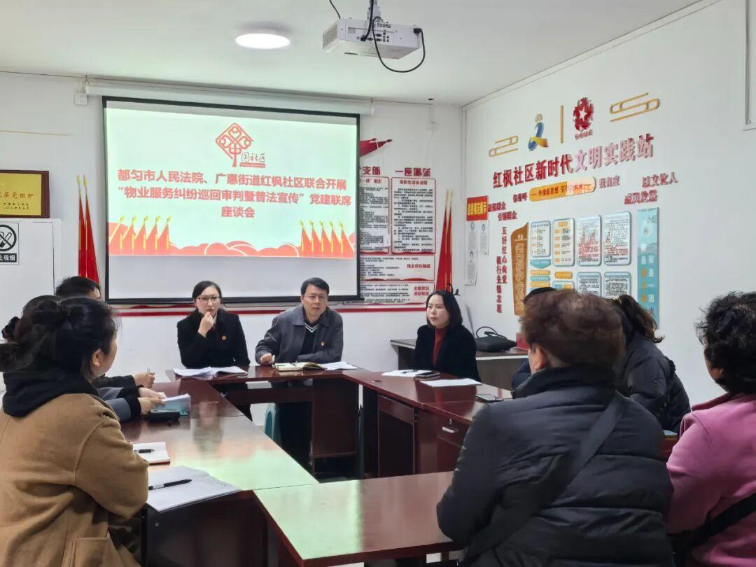 为充分发挥司法职能在保障民生、促进社会和谐中的作用,近日,贵州省黔南州都匀市人民法院融和先锋党支部与都匀市广惠街道红枫社区党委深化党建联建机制,联合开展“物业巡回审判暨普法宣传”主题活动,将司法服务延伸至群众家门口,助力化解物业纠纷难题。