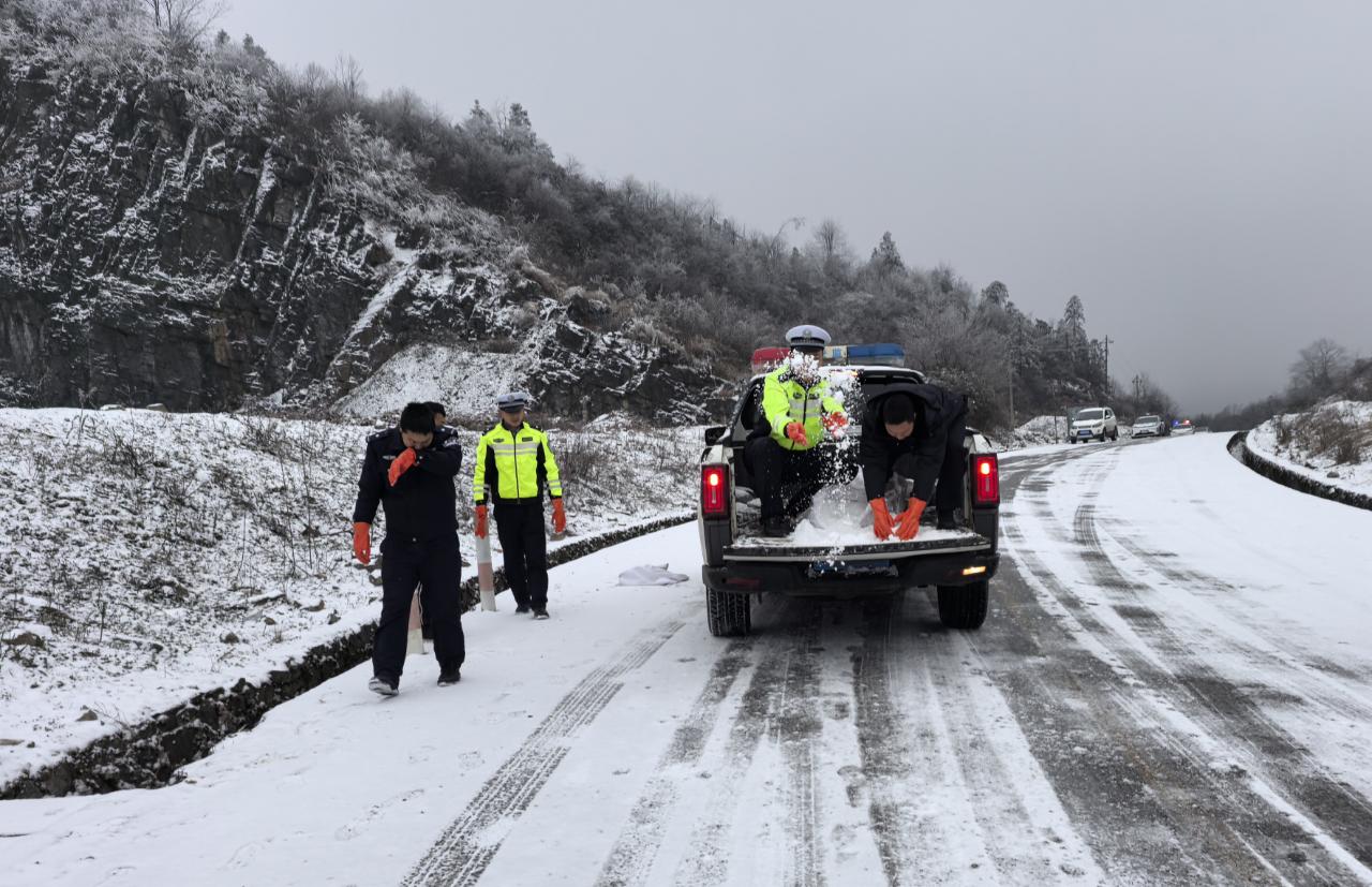 图为务川公安交警撒盐除冰。