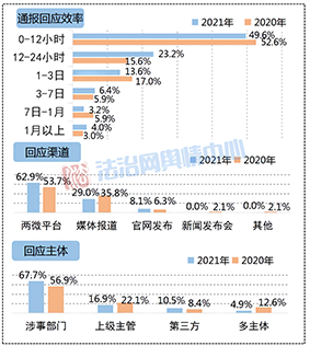 从回应主体来看,与2020年相比,由涉事部门进行回应的事件数量占比有所增加,达到62.9%,表明涉事主体主动作为的积极性有所提升;而上级主管部门介入回应的比重下降了近7个百分点,侧面反映出涉事部门舆情应对能力在逐步精进,能够较为及时遏制舆情扩散和波及的范围,一定程度上减轻了级主管部门的应对压力。同时,第三方回应的事件数量比重也略微提升了约2个百分点,显示出不少舆情事件呈现复杂化特征,牵涉主体逐渐多元化并且覆盖多个领域系统,这对部门间的协调衔接工作也提出了更高的要求。此外政法机关内部多主体回应的情况稍有减弱,相关案例所占比重较2020年减少了一半以上,为4.9%。