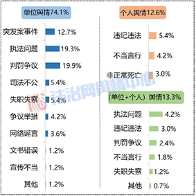 从舆情类型来看,责任主体分为三个层面:涉及政法单位的舆情占比74.1%,涉及政法干警个人的舆情占比12.7%,涉及单位和个人的复合舆情占比13.3%。