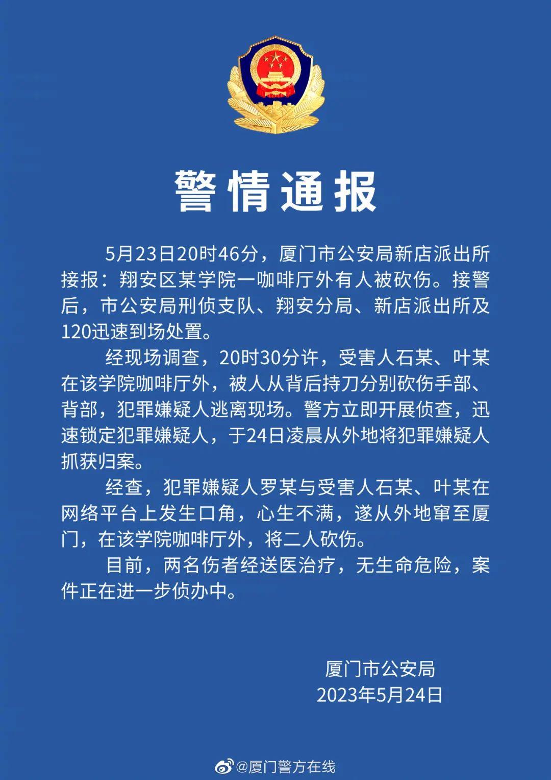 5月24日0时许,顶端新闻记者联系到厦门市翔安区新店派出所及翔安区公安局,相关工作人员均表示,警方已经介入调查,后续会发布通报。当日12时许,“@厦门警方在线”发布警情通报称,5月23日20时30分许,受害人石某、叶某在某学院咖啡厅外,被人从背后持刀分别砍伤手部、背部。20时46分,厦门市公安局新店派出所接报立即开展侦查,于24日凌晨从外地将犯罪嫌疑人抓获归案。经查,犯罪嫌疑人罗某与受害人石某、叶某在网络平台上发生口角,心生不满,遂从外地窜至厦门实施作案。目前,两名伤者经送医治疗,无生命危险,案件正在进一步侦办中。