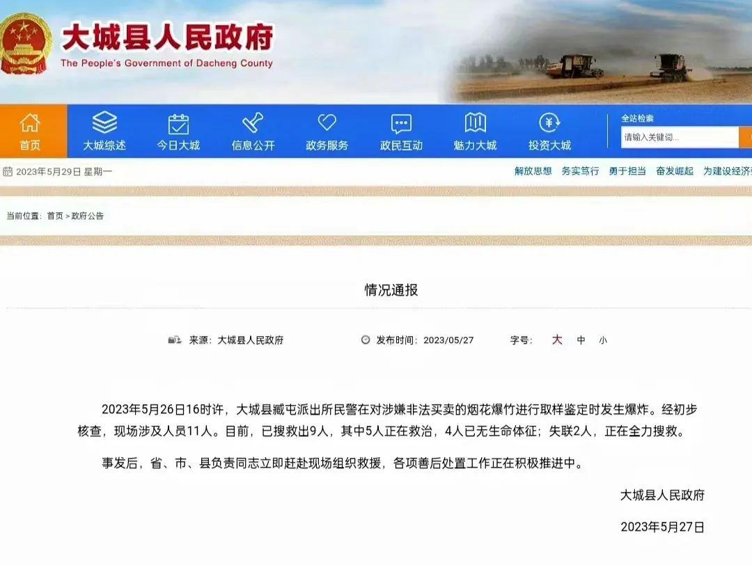 5月26日下午,网传河北大城县一派出所院内发生爆炸,事故原因引发网民追问。5月27日8时许,大城县人民政府网站通报称:“5月26日16时许,大城县臧屯派出所民警在对涉嫌非法买卖的烟花爆竹进行取样鉴定时发生爆炸。经初步核查,现场涉及人员11人。其中,4人已无生命体征,失联2人。”然而,通报中提及的爆炸原因却成为后续舆情发酵点,网民不解派出所民警为何要去鉴定烟花爆竹,部分网民借机对死去民警进行冷嘲热讽,发布揣测性信息,并获得其他网民点赞。面对这种局面,当地政府并未进行回应和解释,认证为“河北省公安厅政治部副主任”的账号“@永华的小菜园”批评当地的信息发布“语焉不详导致误读”。