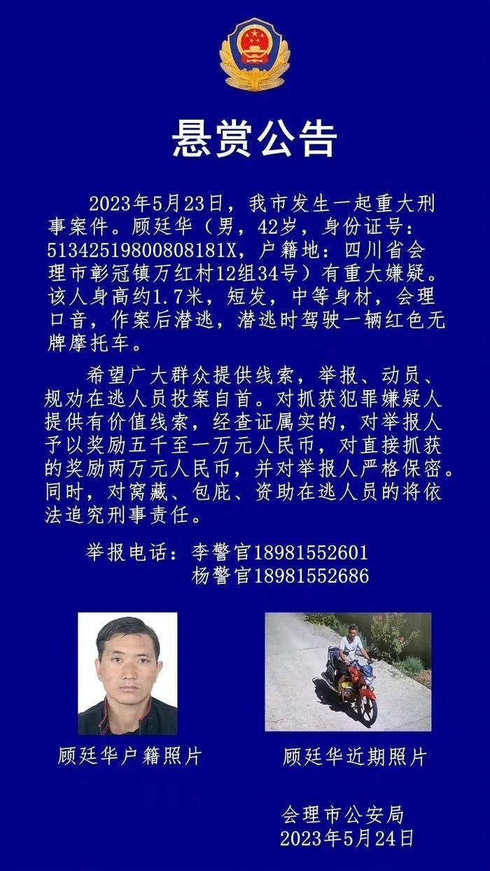 5月24日,四川凉山州会理市公安局发布悬赏公告称,5月23日,会理市发生一起重大刑事案件,顾延华有重大嫌疑。公告详细描述了嫌疑人的体貌特征、逃逸时使用的交通工具以及奖励金额等。然而,这则常见的悬赏公告却在社交媒体上引发网民热议,相关微博话题阅读量达到2.5亿人次。不少网民追问案件到底有多重大,不满警方为何不在公告中描述详细案情。还有一些网民认为嫌疑人如此危险,警方却鼓励群众抓捕,这种方式不妥。对此,会理警方并未予以明确回应,舆情热度随后逐步下降。