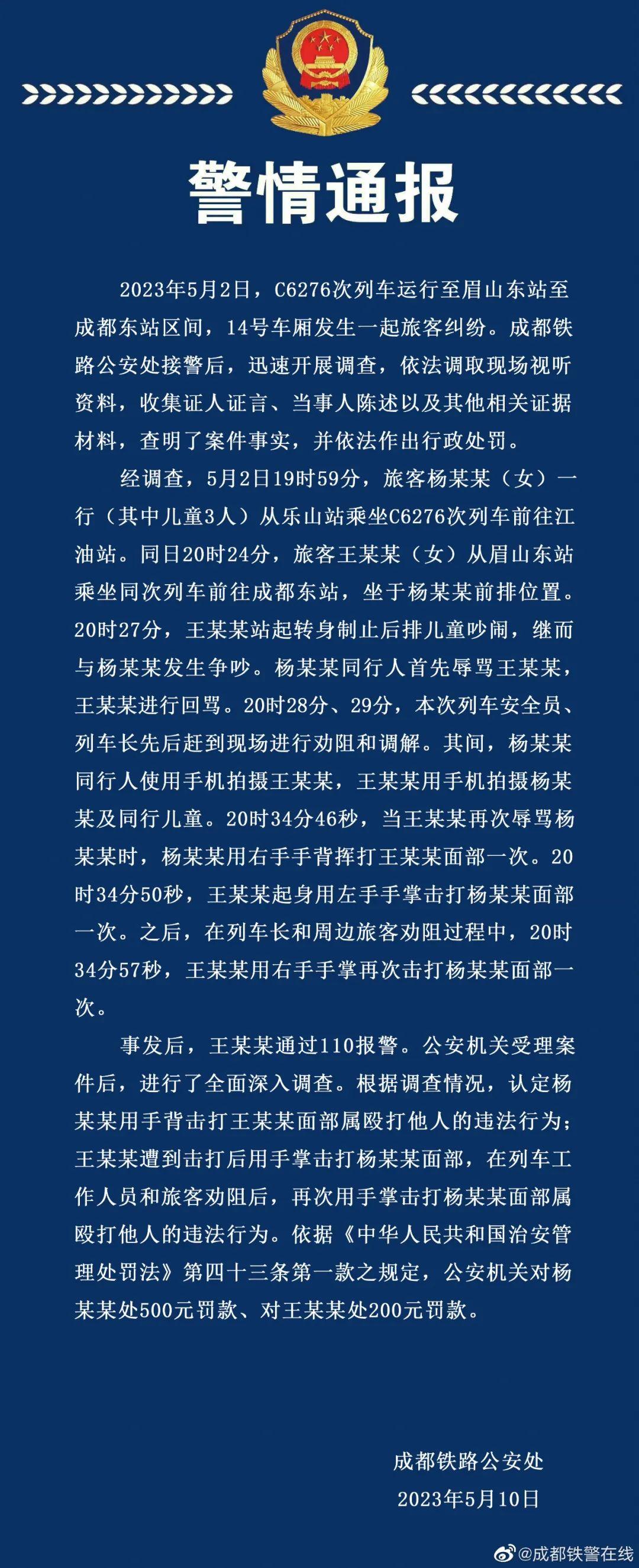 面对网络质疑,5月10日,成都铁路公安处官方微博“@成都铁警在线”发布警情通报称,根据调查情况,认定杨某某用手背击打王某某面部属殴打他人的违法行为;王某某遭到击打后用手掌击打杨某某面部,在列车工作人员和旅客劝阻后,再次用手掌击打杨某某面部属殴打他人的违法行为。警方据此认为双方均违反治安管理处罚法,并处以不同金额的罚款。随后,四川广播电视台“@四川观察”、封面新闻公布现场视频,涉及列车车厢监控、列车长巡检记录仪、当事双方手机所拍视频等多个角度,直观地呈现双方发生争执继而爆发肢体冲突的过程。网络讨论热度再次攀升,微博上形成“#高铁掌掴事件双方曾多次对骂#”“#高铁被打女子2次打人被认定违法#”“#王某某被打后两次掌掴杨某某#”等多个话题,不少网民一改之前支持王某某的立场。但部分网民仍从情感角度出发,质疑官方对视频进行二次剪辑,认为警方苛求被打者还击的间隔时间有失公平。