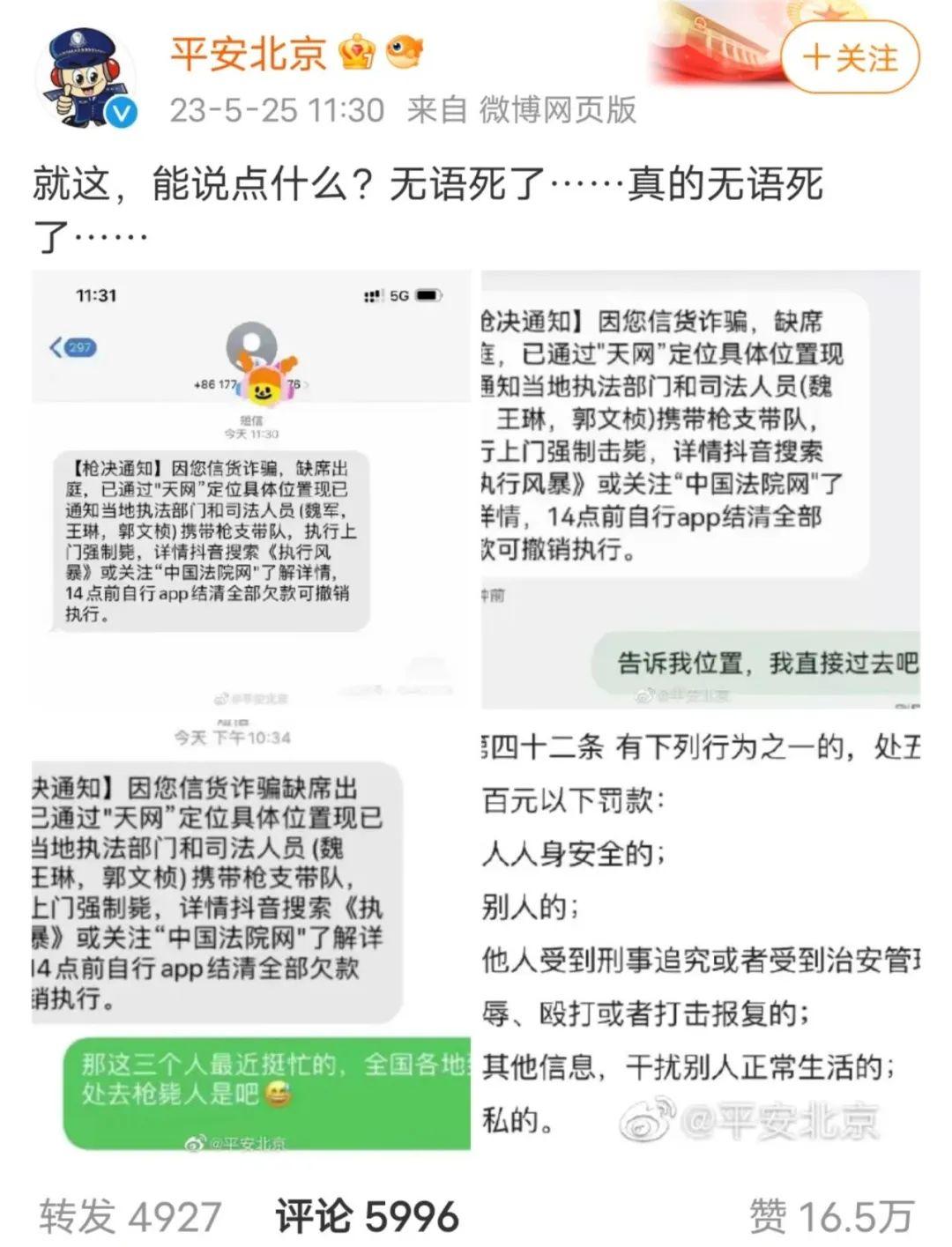 近日,多名网民晒出图片称收到“强制枪毙”诈骗短信,引发一小波关注。5月25日11时许,北京市公安局官方微博“@平安北京”发布一则为几张诈骗短信截图的微博,图片内容相同皆写着:“因您信贷诈骗,缺席出庭,已通过‘天网’定位具体位置,现已通知当地执法部门和司法人员(魏军,王琳,郭文祯)携带枪支带队,执行上门强制枪毙,详情抖音搜索《执行风暴》或关注‘中国法院网’了解详情,14点前自行app结清全部欠款可撤销执行。”对此,“@平安北京”直言道“就这,能说点什么?真的无语死了”。随后,还配了治安管理处罚法的截图,指出发短信恐吓他人所面临的处罚。该则微博迅速引发大量网民围观,相关微博转评超过1.1万次,点赞16.5万次。多数网民表示骗子侮辱人智商,并留言调侃称“笑死,现在枪决都能上门服务了”“这三个人挺忙,全国各地到处去枪毙人”。