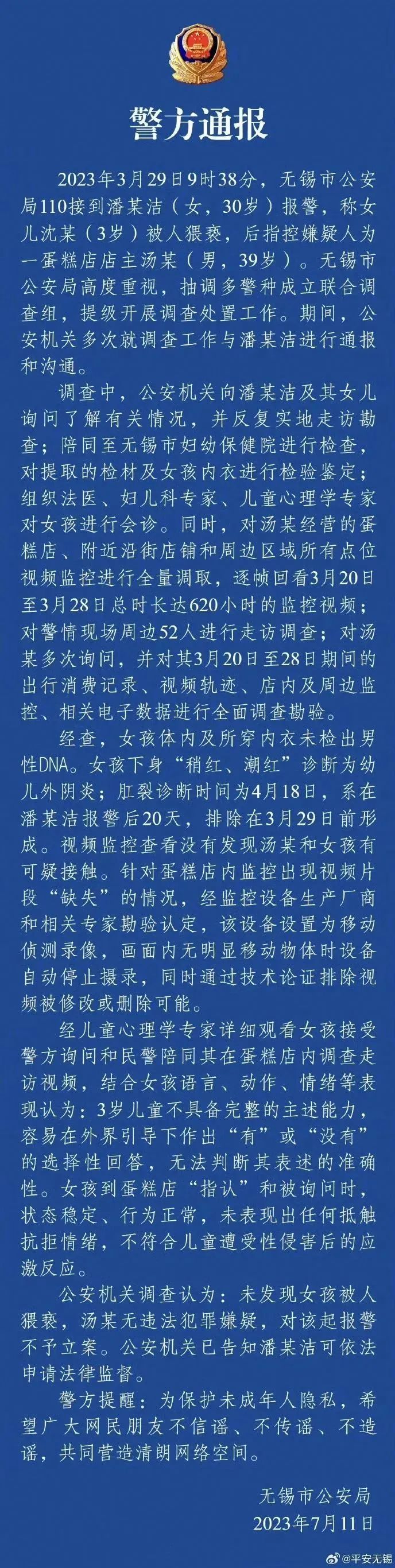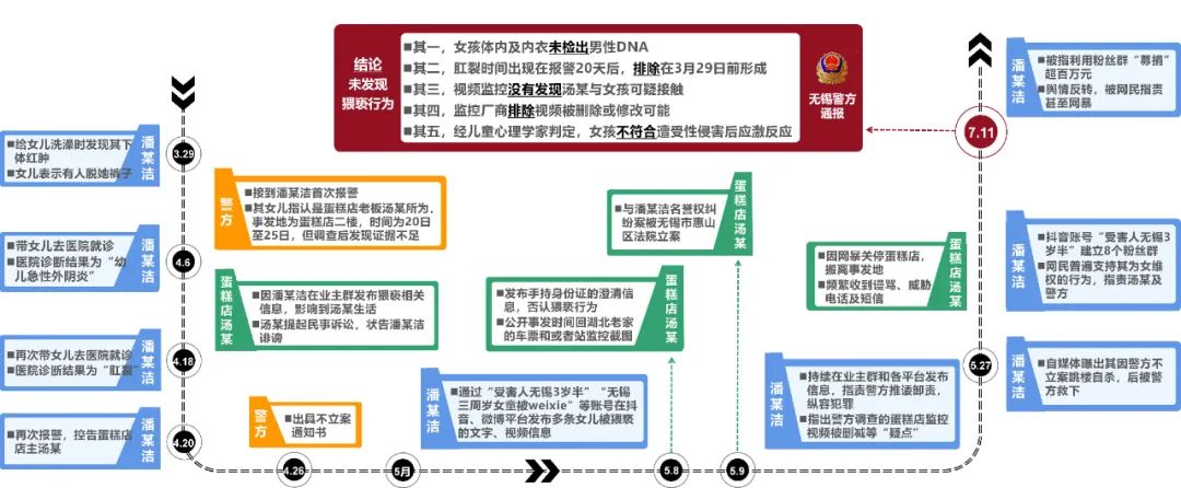 面对巨大的舆情压力,7月11日,无锡市公安局发布通报,详述调查过程,包括DNA检测、肛裂原因排除、视频监控核查、心理学家判定等内容。通报全文800余字,逻辑清晰、内容详实,“不存在猥亵行为”这一结论获得舆论认可,“#警方通报无锡3岁女童事件调查结果#”等微博话题阅读量累计近6亿。至此,舆情反转,多数网民指责潘某洁虚构事实、利用女儿造谣污蔑,呼吁依法对其严惩。