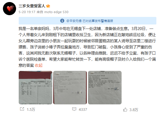 2023年5月起,名为“受害人无锡3岁半”“无锡三周岁女童被weixie”的账号在抖音、微博等平台发布百余条视频、网帖称,其是名单亲妈妈,3岁女儿被隔壁蛋糕店老板多次猥亵,但因蛋糕店内摄像头录像有“缺失”,证据不足,警方不予立案。该用户在多篇帖文中质问“警方为什么不立案”,并恳求网民对其声援,“还孩子一个公道”。相关信息经网络传播后,“女童”“猥亵”“不立案”等关键词叠加,网民的同情心、正义感被广泛调动,“为无锡蛋糕店女孩发声”“严惩蛋糕店主”等内容充斥评论区。