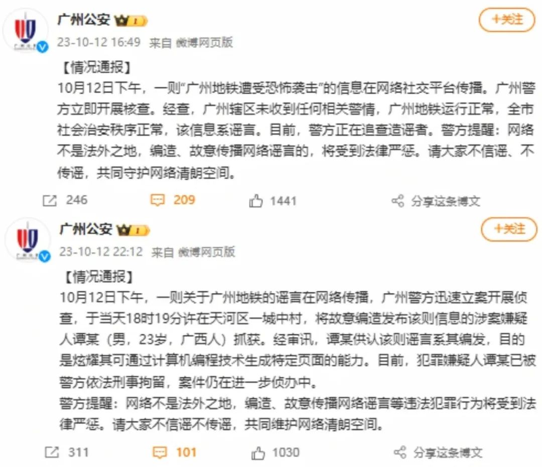 【典型案例】10月12日下午,一则“广州地铁遭受恐怖袭击”的信息在网络社交平台传播。此则消息以截图的形式被传播,图片显示作者为“广州市公安局”,内容称“10月12日下午14时,广州市地铁3号线珠江新城站,3名恐怖分子携带TNT炸药在地铁抢劫,走火发生意外,产生剧烈爆炸,造成多方伤亡”。当日16时49分,官方微博“@广州公安”发布通报进行辟谣。同日22时12分,“@广州公安”再次发布通报称,当天18时19分许在天河区一城中村,警方将故意编造发布该则信息的涉案嫌疑人谭某抓获。经审讯,谭某供认该则谣言系其编发,目的是炫耀其可通过计算机编程技术生成特定页面的能力。