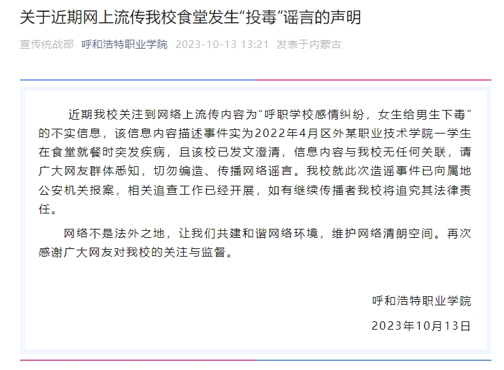 【典型案例】自10月初,连续有网民在社交媒体发视频称,呼和浩特职业学院发生悲剧,一名男生因感情纠纷被女生下毒致死,引发社会关注。10月13日,该校发布了一份声明,澄清这条信息不实,与学校无任何关联。据悉,网络流传的视频中描述的事件实为2022年4月江苏南京交通职业技术学院一学生在食堂就餐时突发疾病 ,并非因为女生下毒。而且,江苏南京交通职业技术学院在当时就已经发布了相关澄清。再如,10月18日,网传江苏南京有男子在酒吧外性侵一名醉酒女子。当日,事发地所属南京市警方相关工作人员回应称,警方已查清此事,没有性侵,网传情况有夸大成分。另据警方透露,某社交网站流传的不实消息,“是专门的AI软件写的”。