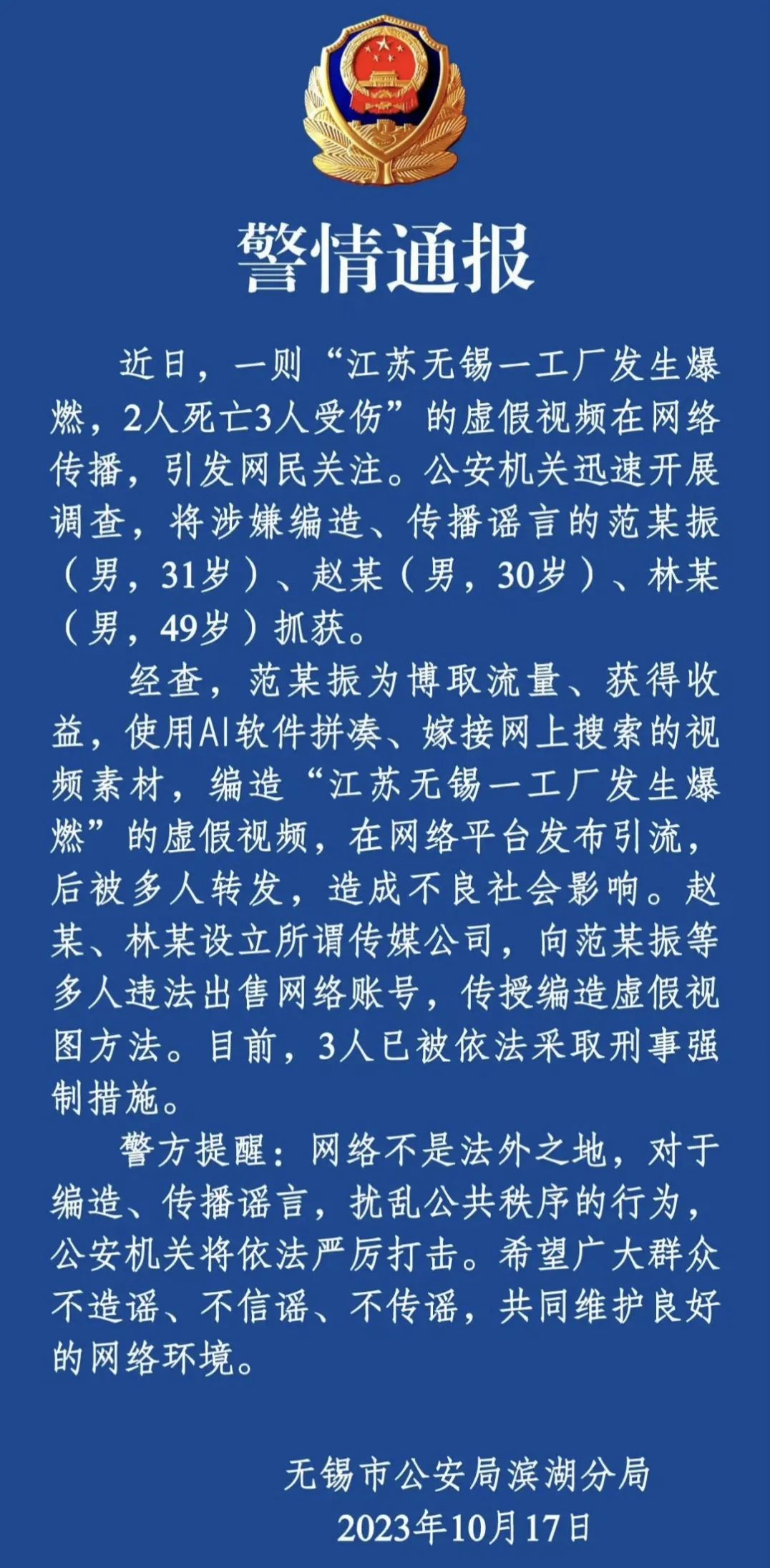 【典型案例】10月17日,一则“江苏无锡一工厂发生爆燃,2人死亡3人受伤”的虚假视频在网络传播,引发网民关注。当日20时许,无锡市公安局滨湖分局微信公众号“滨湖警事”发布警情通报,称此为一起谣言事件,已经将造谣、传谣的范某、赵某、林某三人抓获。经查,范某为博取流量、获得收益,使用AI软件拼凑、嫁接网上搜索的视频素材,编造相关虚假视频,在网络平台发布引流,后被多人转发,造成不良社会影响。赵某、林某设立所谓传媒公司,向范某等多人违法出售网络账号,传授编造虚假视图方法。