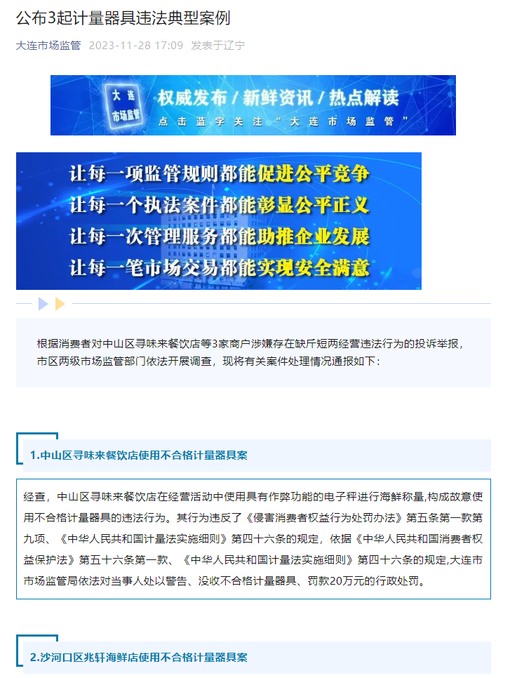 11月28日,微信公众号“大连市场监管”发布情况通报称,根据消费者对3家商户涉嫌缺斤短两经营的投诉举报,市区两级市场监管部门依法开展调查,现将对中山区寻味来餐饮店、沙河口区福之源生鲜超市、沙河口区兆轩海鲜店分别处以20万元、10万元、10万元的行政处罚,警告并没收不合格计量器具。
