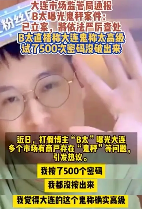 11月9日,“B太”发布实测海鲜加工餐厅的视频,称其到访的3家海鲜加工商家均疑似在秤上做了手脚。“B太”尝试破解商家使用的“鬼秤”密码时,被商家推搡,还遭威胁“把眼镜给你砸了”;其拨打市场监管局电话后,等待一个半小时仍无人到场,直到“B太”开启直播,工作人员才姗姗来迟。“B太”出示相关视频证据,经检查该商家的电子秤虽然有强检合格证,但没有铅封。而当“鬼秤”被带到市场监管局时,专业检测人员只对“问题电子秤”进行简单检测后就宣布该秤“无问题”。当“B太”提出对电子秤进行密码破译时,检测人员表示“我也跟着学习学习”,但“B太”尝试了500多个密码都未破解成功。次日,该电子秤被送往无锡检测。“B太”在微博和抖音平台发布相关视频,播放量迅速破亿次,多数网民指责店家有恃无恐,质疑市场监管部门消极怠工;部分计划去大连旅游的网民还表示,因担心被“坑”将临时改变目的地。