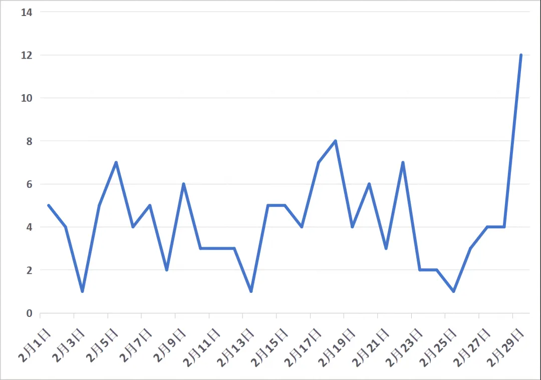 2024年2月,法治网舆情中心共监测到热点事件123起。从类型分布上看,企业相关热点事件最多发,占比约25%;社会新闻次之,占比近19%;突发事故及案事件总体热度较高。从时间分布上看,2月29日发生的热点事件最多,达12起。热度最高的事件为“2024年央视春晚”,其次为多部春节档电影上映引发热议、武汉冻雨、OpenAI推出人工智能视频生成模型“Sora”等事件。整体上看,2月并未出现高热度、高烈度的负面舆情事件,舆论场平稳有序。