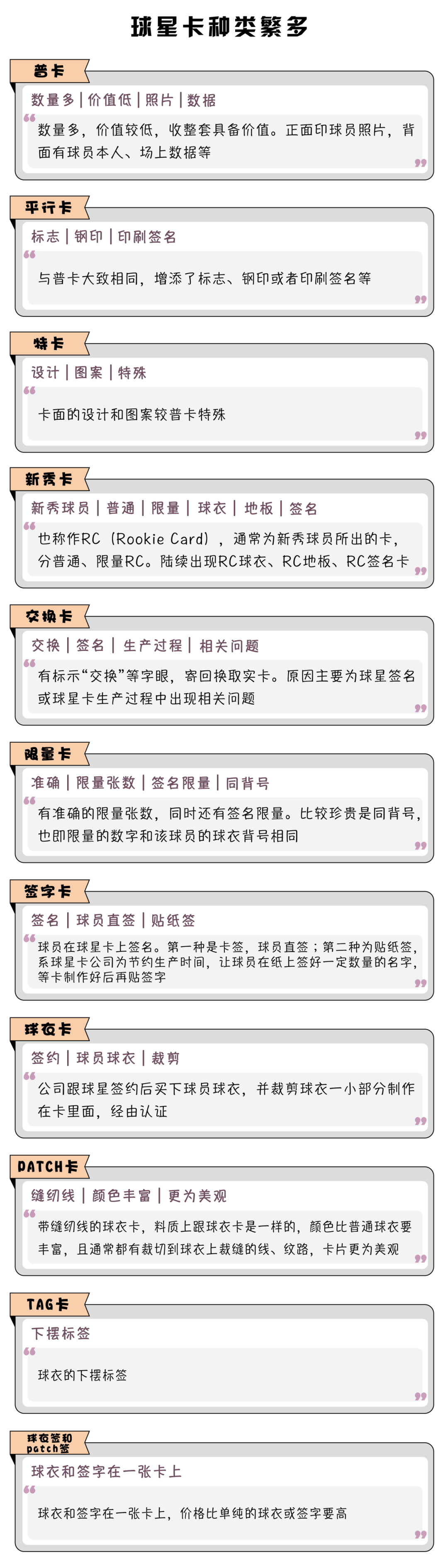 球星卡涉及篮球、足球、棒球等领域,卡片种类繁多,包括普卡、平行卡、特卡、新秀卡、交换卡、限量卡、签字卡等,为具有不同需求的消费者提供了多种选择。