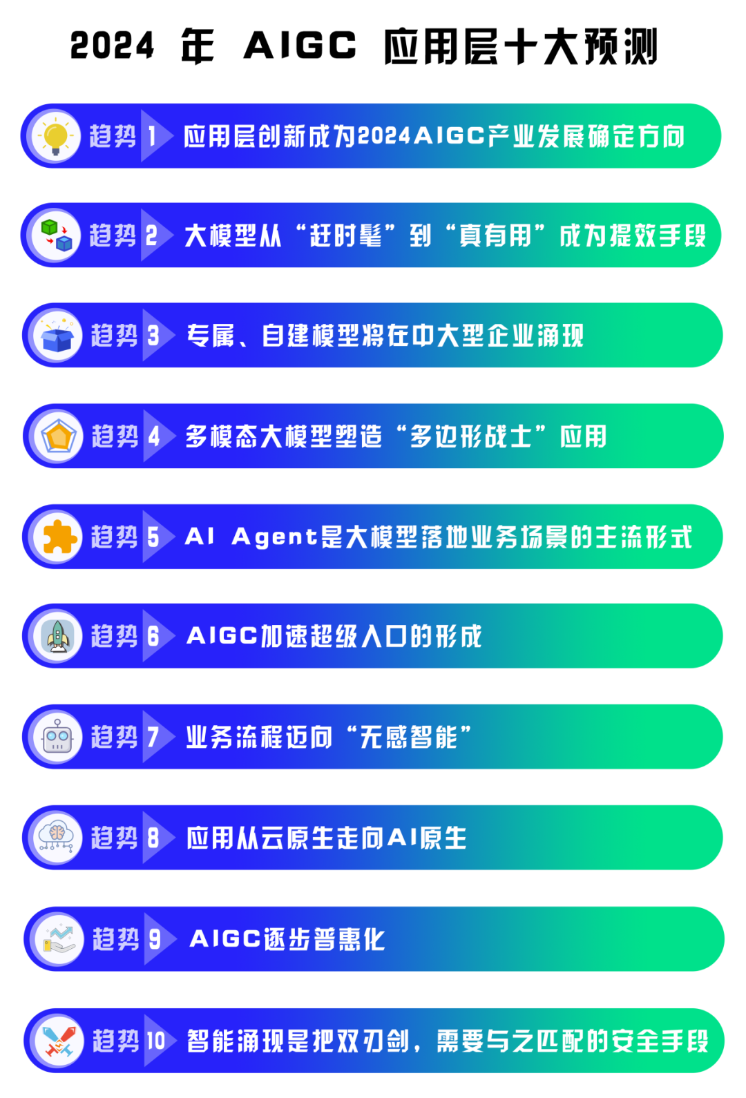 《2024 AIGC应用层十大趋势白皮书》中列举了2024年生成式人工智能应用层十大预测,除了对生成式人工智能产业发展及应用场景的预测外,还提到了“智能涌现是把双刃剑,需要与之匹配的安全措施”。