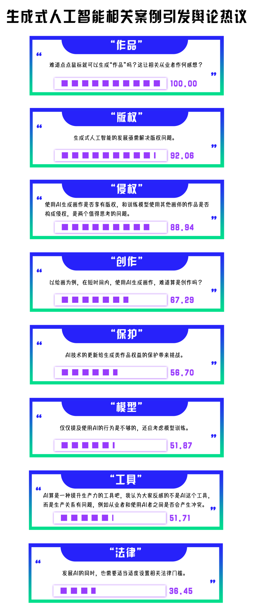 与生成式人工智能有关的案件一经宣判,便引发了舆论广泛关注,“作品”“版权”“模型”“工具”“法律”等词语频繁被提及,成为公众讨论的焦点。