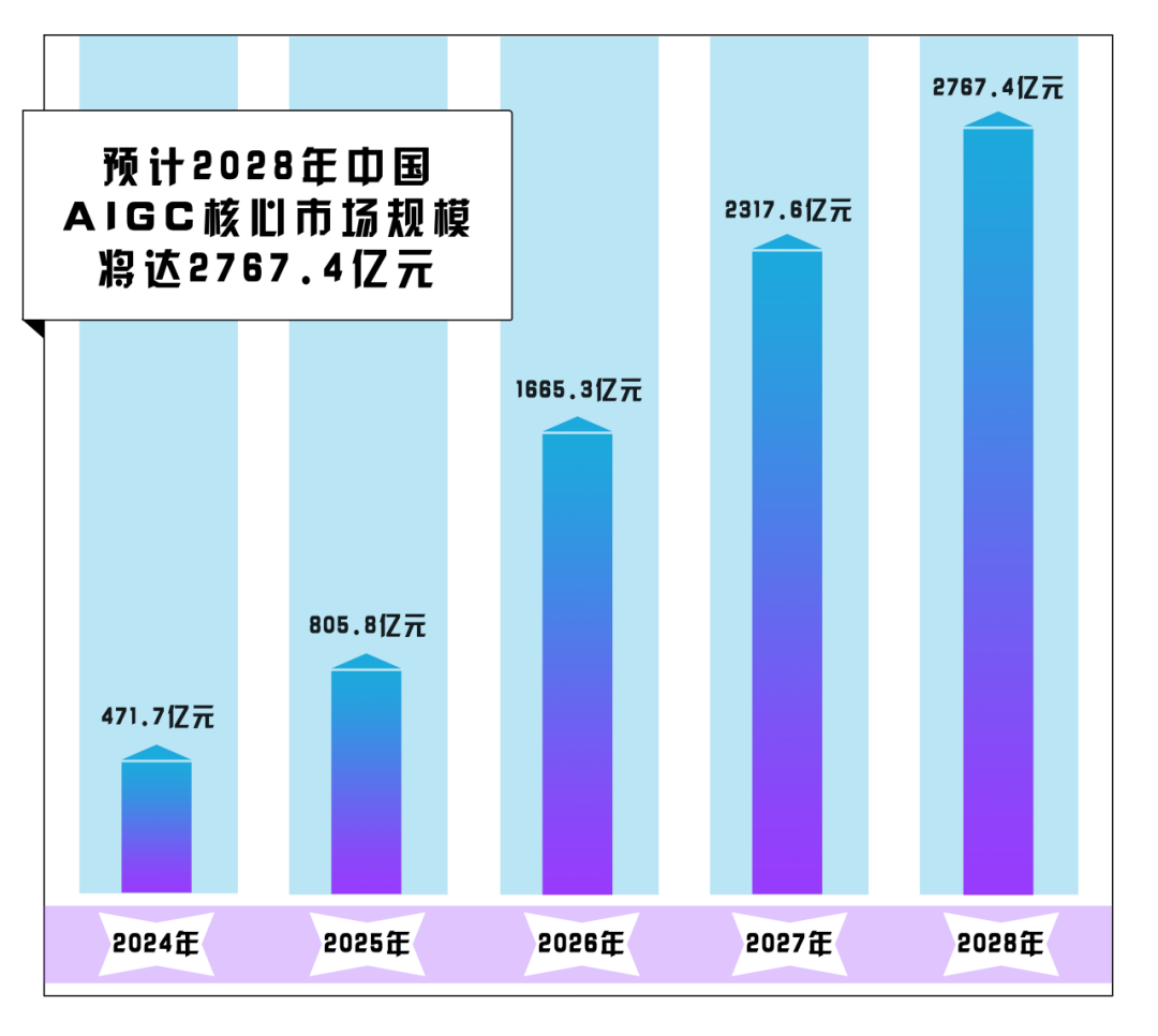 艾媒咨询发布的《2023年中国AIGC行业发展研究报告》显示,2024年我国生成式人工智能行业核心市场规模预计为471.7亿元,2028年将达2767.4亿元,规模相较2024年翻了近5倍。持续扩大的市场规模,也面临着风险和挑战。
