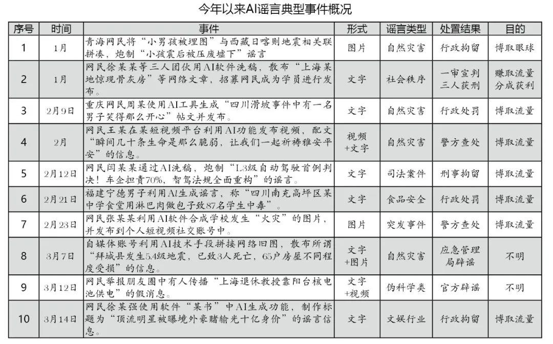 10起典型案例中,有4起AI谣言与自然灾害相关,包括地震、山体滑坡等;2起谣言涉及食品安全和突发事件,分别为“四川某中学食堂用淋巴肉做包子致87名学生中毒”和“某地学校发生火灾”;还有4起谣言分别涉及伪科学、文娱行业、社会秩序和司法案件四个方面。AI谣言表现形式较多,大多通过微博、微信、短视频等社交媒体渠道扩散,并以文字、图片、视频形式单一或“搭配”传播,比如“西藏定日县地震一小孩被压废墟”谣言形式为图片,“上海退休教授靠阳台核电池供电”谣言则是以“文字+视频”的形式传播。造谣动机方面,有8起事件明确提到造谣者是为了蹭热点、赚取流量收益,可见流量经济仍然是AI谣言存在的底层逻辑。10起事件中,有2起事件被官方辟谣,但没有其他情况通报,其余8起均有明确处理结果。处置结果方面,10起事件中有5起事件的造谣者被公安机关给予行政处罚或行政拘留,有2起事件进入到司法流程,网民闫某某因刻意炒作“国内首例智能驾驶致死案”,被属地警方刑事拘留;网民徐某某等3人散布“上海某地惊现骨灰房”等谣言,获利数额较大,被上海当地法院以非法经营罪判处有期徒刑一年十个月不等。