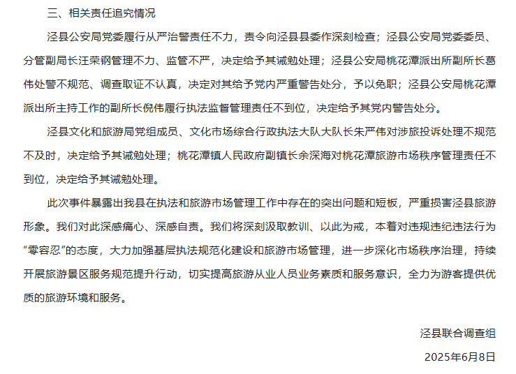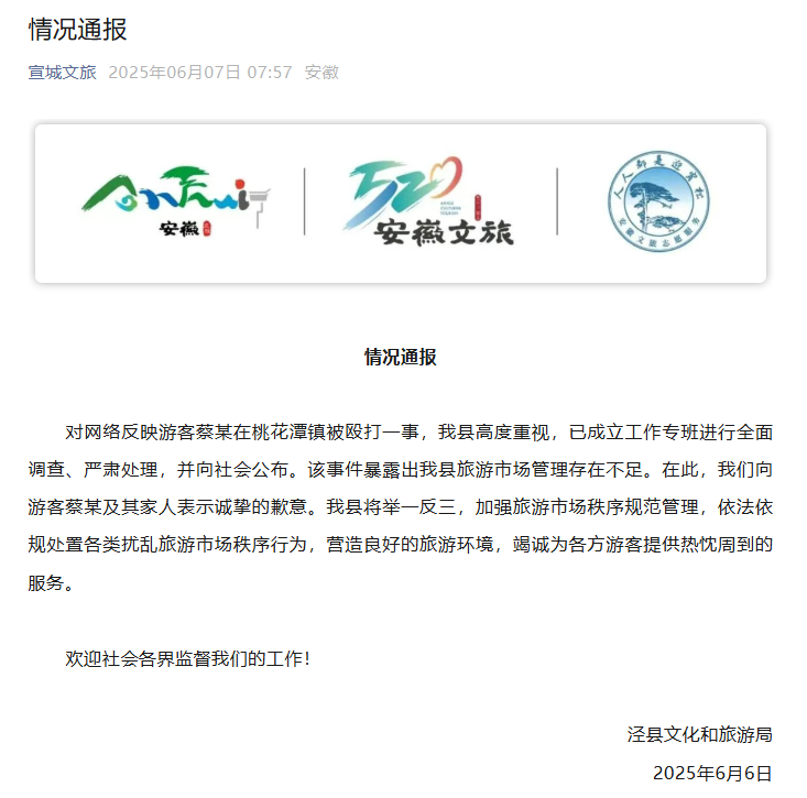 6月7日0时许,泾县文化和旅游局发布情况通报称,已成立工作专班进行全面调查,向游客蔡某及其家人致歉。但舆论怒火并未完全平息,不少网民表示不能仅让文旅部门“背锅”,当地公安机关应深入调查、严肃问责。据微信公众号“泾县人民政府发布”7日晚消息,泾县召开全县旅游市场秩序整治工作会议,会议要求“聚焦短板弱项,抓好旅游市场秩序整治”等。