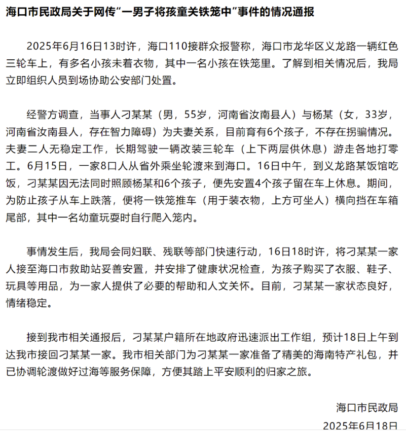 海口市民政局关于网传“一男子将孩童关铁笼中”事件的情况通报