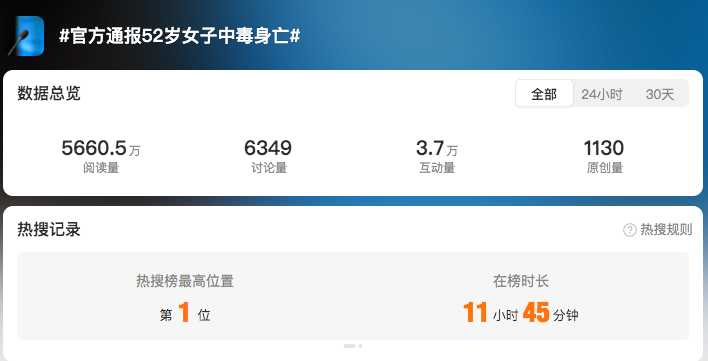 9月15日,浙江省杭州市余杭区闲林街道办事处发布情况通报称,9月9日,涂某某(女,52岁)在进入闲林中路附近空地时,不慎接触废弃氢氟酸中毒,送医后经抢救无效于2025年9月14日凌晨不幸身亡。公安机关在接警后第一时间介入调查;生态环境部门已按规范完成现场无害化处置;街道正在全力推进善后处置工作。目前,事发原因正在进一步调查中。当晚“官方通报52岁女子中毒身亡”登上热搜榜第一位,阅读量迅速破千万。
