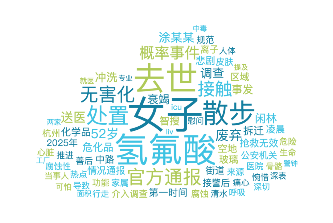 普通市民外出散步竟接触到剧毒物并付出生命代价,此次悲剧令网民产生强烈代入感,触发公众安全焦虑。舆论不仅痛惜于涂女士平白无辜遭遇无妄之灾,还抛出诸多疑问:像氢氟酸这样危险的化学品“为何出现在公共场所”“来源于哪里”“被谁随意丢弃”“谁该为这场悲剧负责”。随着媒体深入调查,披露出“氢氟酸可网上轻易买到”“氢氟酸用途广泛却暗藏致命风险”等更多信息,使得危险化学品生产、经营、使用、废弃处理等全链条规范化问题引发舆论聚焦,目前媒体及网民仍在持续追问中。