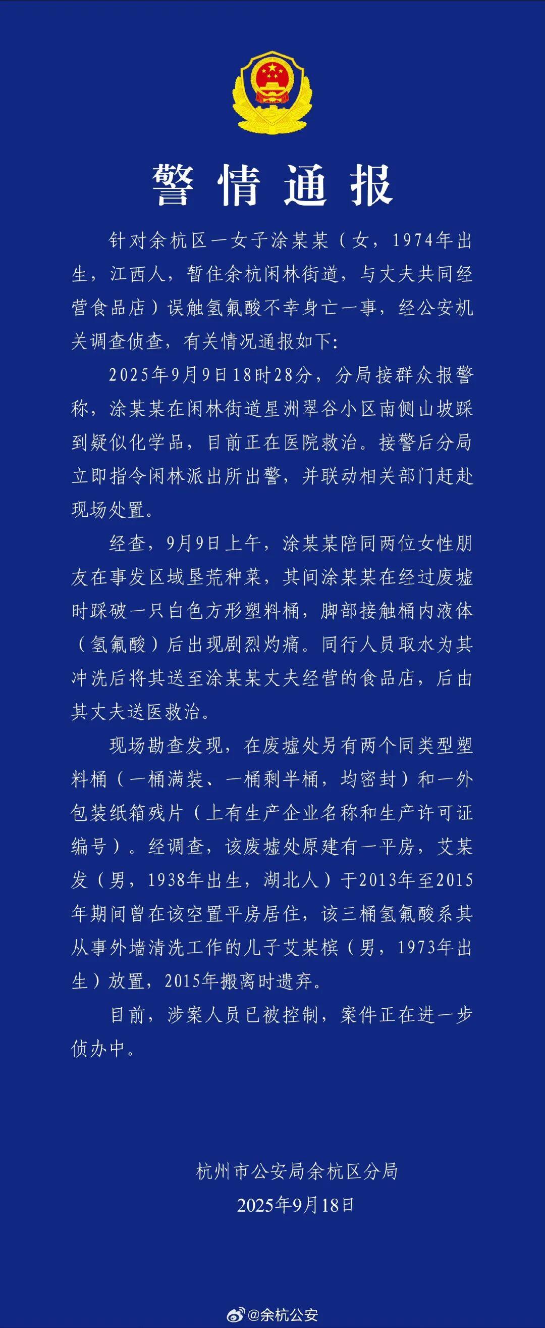 9月18日16时许,“@余杭公安”官方微博发布警情通报。经查,9月9日上午,涂某某陪同两位女性朋友在事发区域垦荒种菜,其间涂某某在经过废墟时踩破一只白色方形塑料桶,脚部接触桶内液体(氢氟酸)后出现剧烈灼痛。同行人员取水为其冲洗后将其送至涂某某丈夫经营的食品店,后由其丈夫送医救治。现场勘查发现,在废墟处另有两个同类型塑料桶(一桶满装、一桶剩半桶,均密封)和一外包装纸箱残片(上有生产企业名称和生产许可证编号)。经调查,该废墟处原建有一平房,艾某发(男,1938年出生,湖北人)于2013年至2015年期间曾在该空置平房居住,该三桶氢氟酸系其从事外墙清洗工作的儿子艾某槟(男,1973年出生)放置,2015年搬离时遗弃。目前,涉案人员已被控制,案件正在进一步侦办中。
