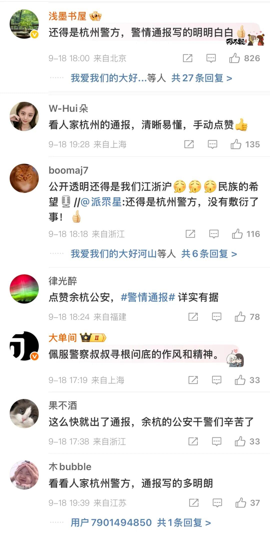 舆论认可警方高效的调查,如网民“@啊妮贝贝-”评论道,遗弃十年还能查到,杭州公安真不错;“@teacherwu09”称这都能抓住,向警方致敬。对于警情通报,大V“@浅墨书屋”称赞警情通报写得清清楚楚,明明白白。网民“@W-Hui朵”评价通报清晰易懂,“@律光醉”称警情通报详实有据,具有说服力。