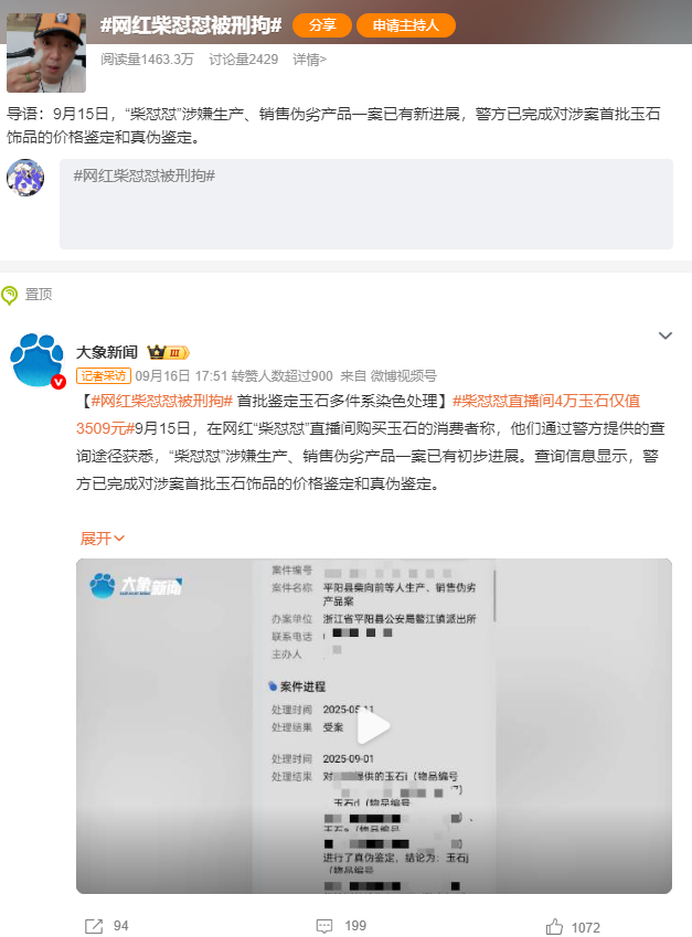 截至9月19日10时,“#柴怼怼被刑拘”“#网友近2万元买玉镯鉴定为染色手镯#”“#民警回应柴怼怼被立案调查#”等相关话题阅读量累计4500万。