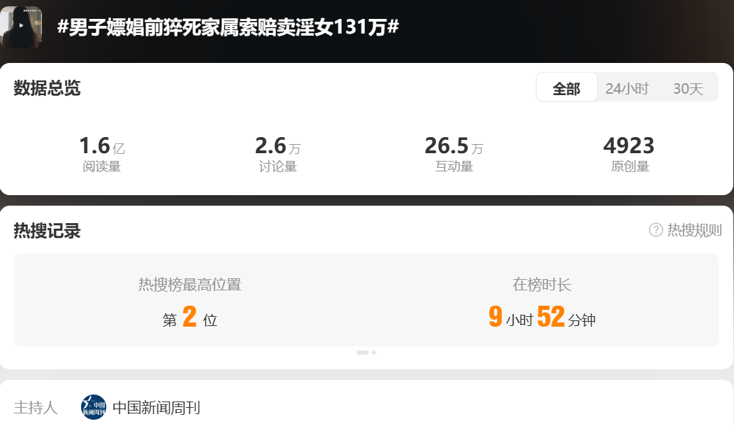 此案被报道后,“@中国新闻周刊”、上观新闻、封面新闻等媒体接力传播,推高舆情热度,微博话题“#男子嫖娼前猝死家属索赔卖淫女131万#”登上热搜榜第2位。
