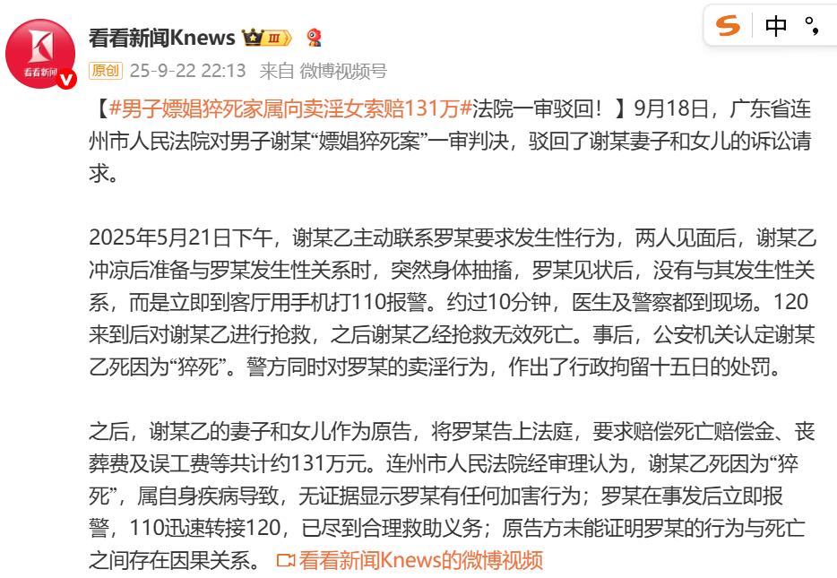 9月22日,据上海电视台“@看看新闻Knews”消息,9月18日,广东省连州市人民法院对男子谢某“嫖娼猝死案”作出一审判决。裁判文书网显示,5月21日,谢某主动联系罗某要求发生性行为,两人见面后,谢某冲凉后准备发生性关系时突然身体抽搐,罗某见状后,立即到客厅拨打110报警。医护人员赶到后对谢某进行抢救,谢某经抢救无效死亡。警方认定谢某死因为“猝死”,对罗某的卖淫行为,作出行政拘留十五日的处罚。事后,谢某的妻子和女儿将罗某告上法庭,要求赔偿死亡赔偿金、丧葬费及误工费等共计约131万元。连州市人民法院经审理认为,谢某死因为“猝死”,属自身疾病导致,无证据显示罗某有任何加害行为;罗某在事发后当即报警并配合120抢救,已尽到合理救助义务;原告方未能证明罗某的行为与死亡之间存在因果关系。据此,该法院驳回谢某妻子和女儿的全部诉讼请求。