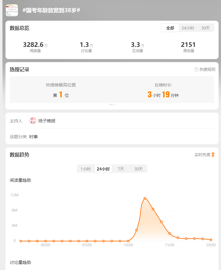 截至10月16日14时,相关信息量9000余条,微博话题“#国考年龄放宽到38岁#”“#应届硕博生国考年龄放宽到43岁#”“#为何要打破国考35岁门槛#”阅读量共计6000万人次。