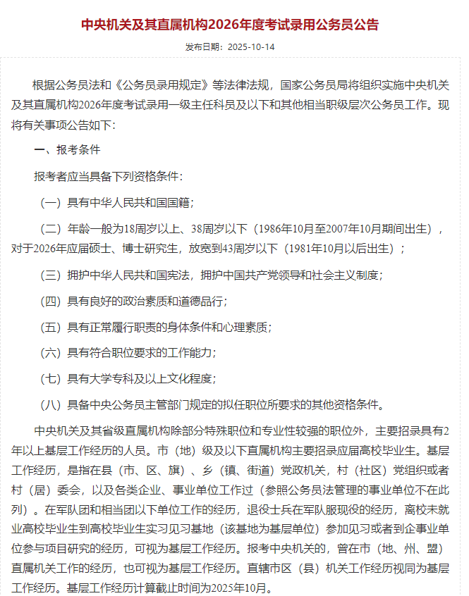 10月14日,国家公务员局网站发布《中央机关及其直属机构2026年度考试录用公务员公告》,公告显示报考条件:年龄一般为18周岁以上、38周岁以下(1986年10月至2007年10月期间出生),对于2026年应届硕士、博士研究生,放宽到43周岁以下(1981年10月以后出生)。这意味着,国家公务员报考者年龄放宽至38周岁以下,打破过去35周岁上限。此外,对于应届生硕士、博士研究生,年龄更是放宽至43周岁以下。