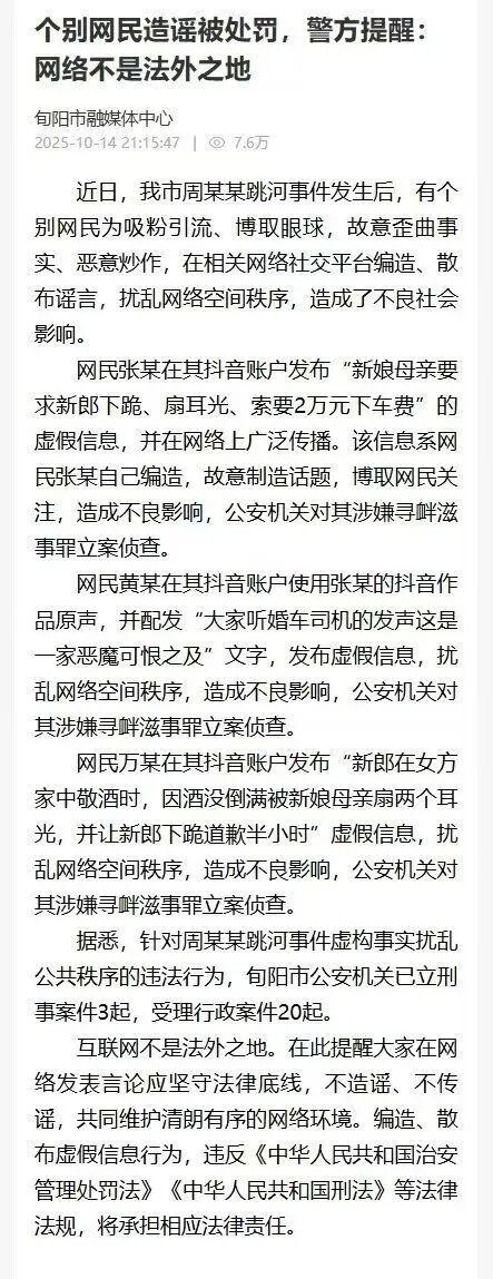 同日,陕西安康旬阳市融媒体中心发布消息称,近日,旬阳市周某某跳河事件发生后,有个别网民为吸粉引流、博取眼球,故意歪曲事实、恶意炒作,在相关网络社交平台编造、散布谣言,扰乱网络空间秩序,造成了不良社会影响。网民张某、黄某、万某在短视频账户发布相关虚假信息,造成不良影响,已被公安机关以涉嫌寻衅滋事罪立案侦查。针对周某某跳河事件虚构事实扰乱公共秩序的违法行为,旬阳市公安机关已立刑事案件3起,受理行政案件20起。舆论普遍表示,官方展现了治理谣言的决心,认为制止谣言最好的方法就是公布调查结果。