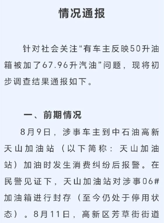 据澎湃新闻8月20日报道,8月9日,车主杨某驾驶油箱总容量50升的小车,在成都市中石油锦华天山站加油,油箱显示为其加注了67.96升汽油。杨某提出异议后,加油站表示只认油枪数据,坚持按67.96升收费,杨某最终结账离开。结账离开前,杨某先后向公安机关、市监局、12345热线等多部门投诉,并要求加油站封枪。三天后,加油站一负责人以私人名义将多收的钱退给杨某,希望其同意油枪解封,但解封后加油站没有给出过任何解释。在“问政四川”平台上,成都市高新区管委会回复“将在15个工作日详细回复”;高新区市场监督管理局综合执法部门工作人员表示,有了进展办案人员会联系投诉人。部分自媒体和网民围绕事件原因进行讨论,要求官方给出一个透明、准确的调查结果。深圳广电集团都市频道“@第一现场”还评论称,“监管部门不应沉默”。