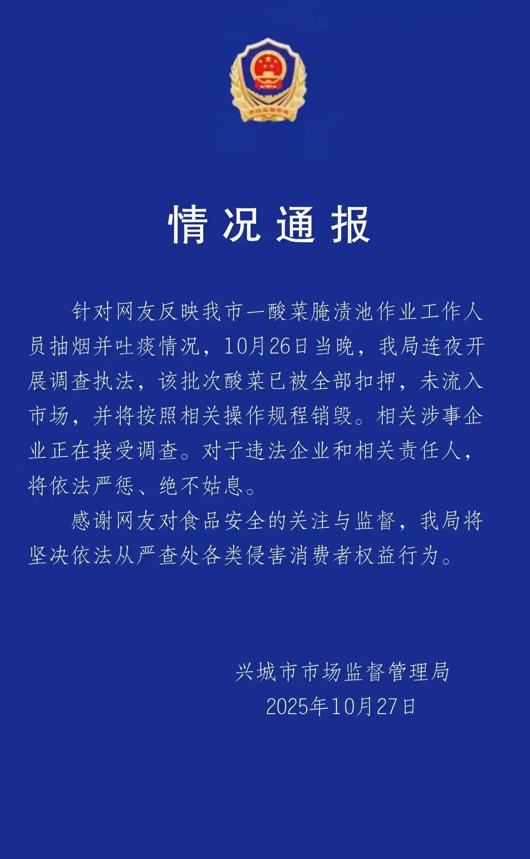10月27日,辽宁省兴城市市场监督管理局通过微信公众号“兴城市市场监督管理局”发布情况通报称,针对网友反映的情况,10月26日当晚,该局连夜开展调查执法,该批次酸菜已被全部扣押,未流入市场,并将按照相关操作规程销毁。涉事企业正在接受调查。对于违法企业和相关责任人,将依法严惩、绝不姑息。随后,中国新闻网、光明网、观察者网等媒体转发报道。
