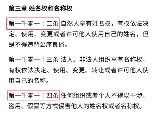 《中华人民共和国民法典》第一千零一十二条、第一千零一十四条规定,自然人享有姓名权,有权依法决定、使用、变更或者许可他人使用自己的姓名,但是不得违背公序良俗。任何组织或者个人不得以干涉、盗用、假冒等方式侵害他人的姓名权或者名称权。
