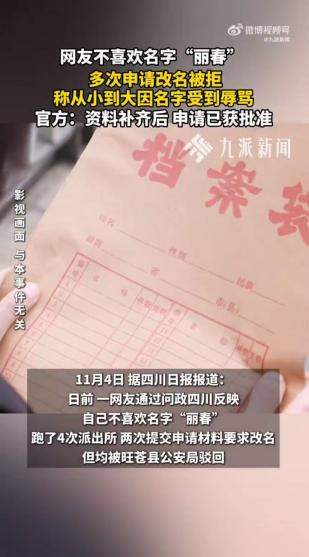 11月5日,据四川日报微信公众号报道,四川省广元市旺苍县一位居民通过“四川省网上群众工作平台——问政四川”反映,自己不喜欢名字“丽春”,跑了四次派出所,两次提交申请材料要求改名,但均被旺苍县公安局驳回。该网民诉苦说,自己从小到大因这个名字受到不少他人辱骂,造成了精神和心理伤害。