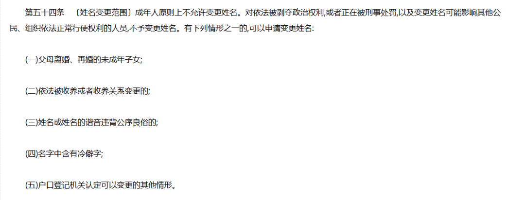 四川省曾经出台了《全省公安机关户政管理工作规程(试行)》。其中,第五十四条规定,成年人原则上不允许变更姓名。有下列情形之一的,可以申请变更姓名:(一)父母离婚、再婚的未成年子女;(二)依法被收养或者收养关系变更的;(三)姓名或姓名的谐音违背公序良俗的;(四)名字中含有冷僻字;(五)户口登记机关认定可以变更的其他情形。
